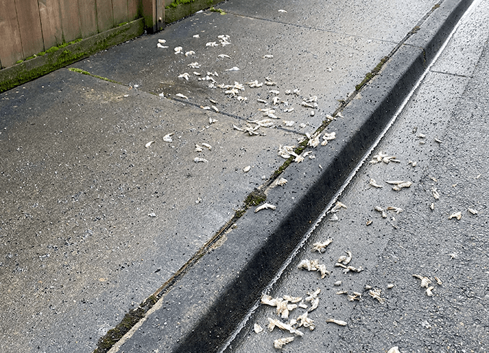 At this location on Brickyard Road, we often see shrimp shells scattered on the sidewalk, but today they outdid themselves. By the pattern of the trash, we can see exactly where the garbage was tossed over the fence. “Hey, we don’t want to stink up our garbage can.”