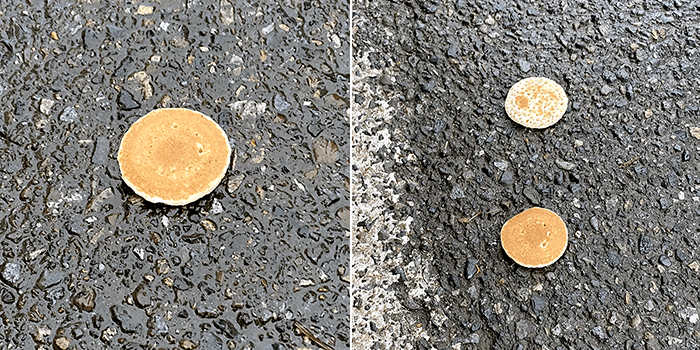 Mini-pancakes. We found a total of five of these along a two-mile section of our route. They could have left us some butter and syrup. They were kind of dry.