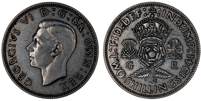 This is the inscription on both sides of a 1941 two-shilling British coin.