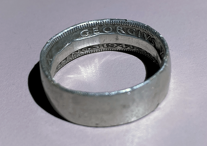The ring appears to be a form of WWII Trench Art. Although the ring we found is British, we found an article about Italian POWs in Australia making them out of Australian Florins (two-shilling coins) .