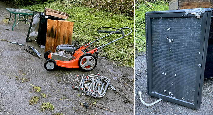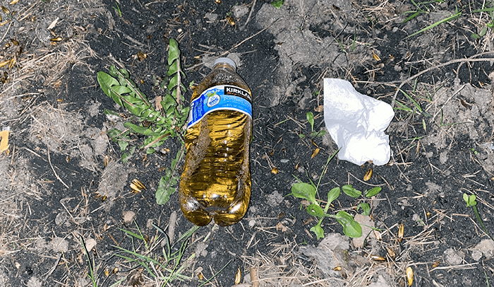 A water bottle filled with yellow liquid. We’re not sure what it is, but we’ve read the stories about Amazon drivers peeing in bottles. We carefully emptied it into the bushes and sealed the bottle back up. And yes, we wear rubber gloves. See number 7 of our top ten reasons to wear gloves.