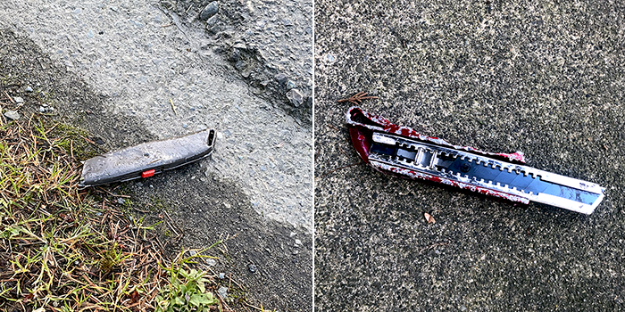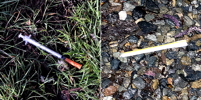 A needle tossed by the side of the road on Juanita-Woodinville Way and a plastic straw with a melted tip. Never mind the dope, inhaling fumes from burning plastic is not good for you either.