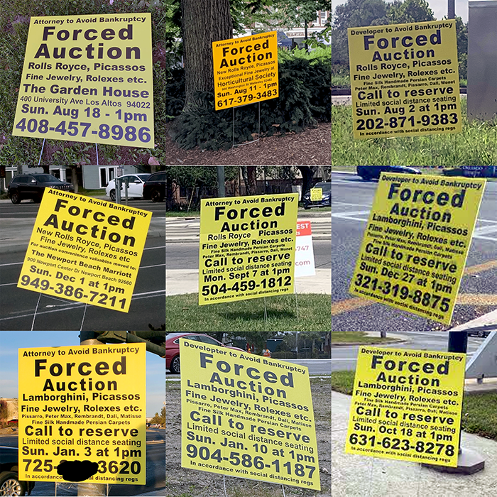 We really wish they had not done that and let the secret out. This is how we got our Picasso. Can anybody spell S-C-A-M! From this corner, we could see eight of these signs. On the rest of our walk, we counted a total of 19 signs for the auction the next day. Similar signs are used across the country, for example,