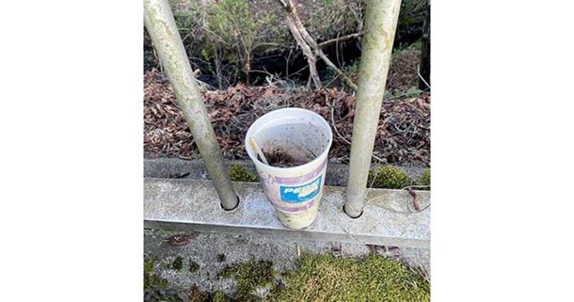 Okay, normally a cup is not something we would take a picture of, but this was a challenge. On Juanita-Woodinville Way, there is a bridge across a small creek. They put a fence with bars to keep people from attempting to jump from the bridge and getting their feet wet. Anyway, someone threw a cup over the fence to see if it got wet, but it got caught on a ledge. We spent a good five minutes of our lives stretching our arm plus picker through the bars to, millimeter-by-millimeter, coax the cup within range to retrieve it. So, yes, admire the cup.