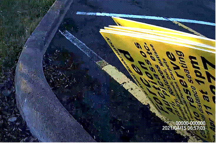 We left four at a bus stop hoping they get picked up when Metro empties the trash, these six at one corner of the park-and-ride and four more at another corner. Finally, two more at an intersection with another downed sign. In all, we stacked up sixteen of the signs. Yes, we’ll probably need to pick them up with the car, but we can dream, can’t we?