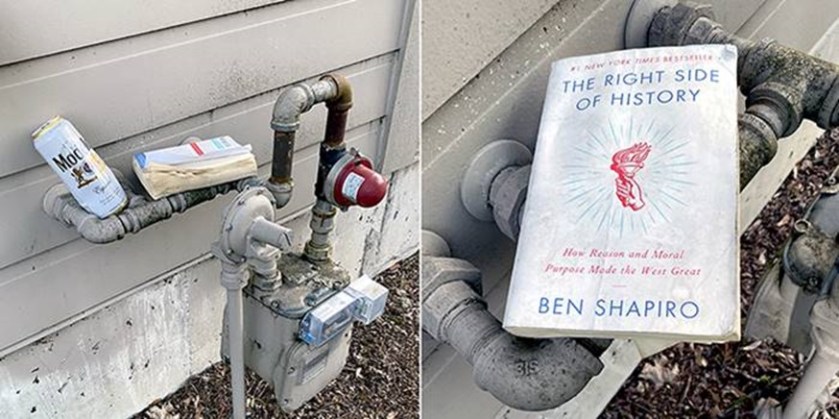 Last time there were more beers and a copy of a foreign affairs journal. Today was a copy of “The Right Side of History” by Ben Shapiro and only one beer. It must have been a sobering book.
