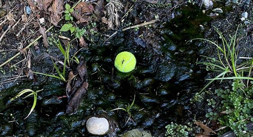 We found a very clean tennis ball floating in dirty, black water.
