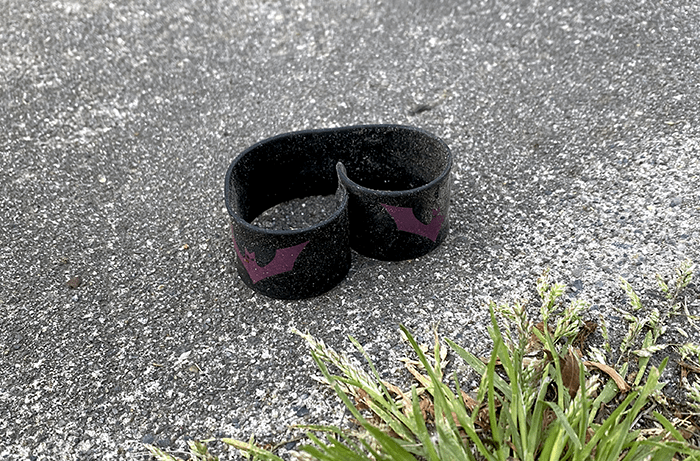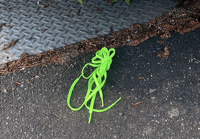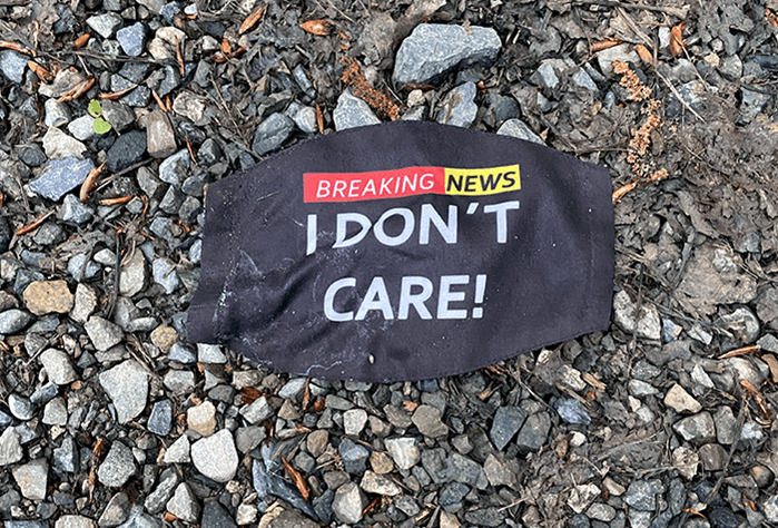 This marker-and-tape battle kept going with threats and new signs for the next few months. Today, one of the original signs with the note appeared on the ground. We carried it home and recycled it to close the last chapter in the story.