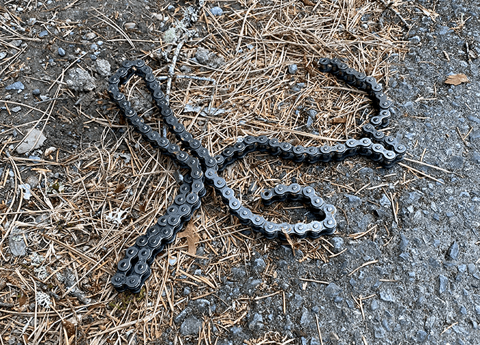 The master link of a motorcycle chain failed, and the rider left the chain. Perhaps he had a bad chain reaction.