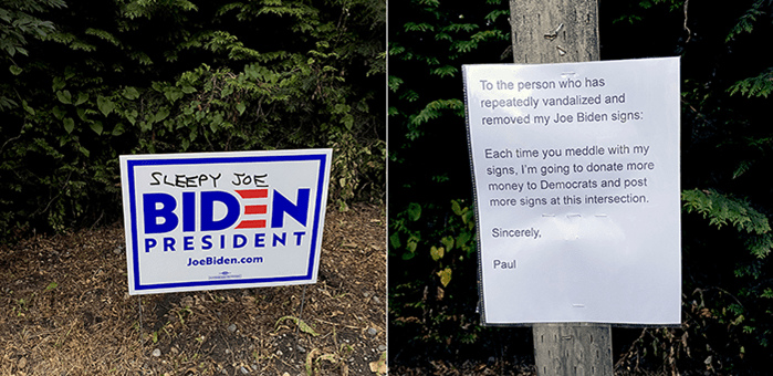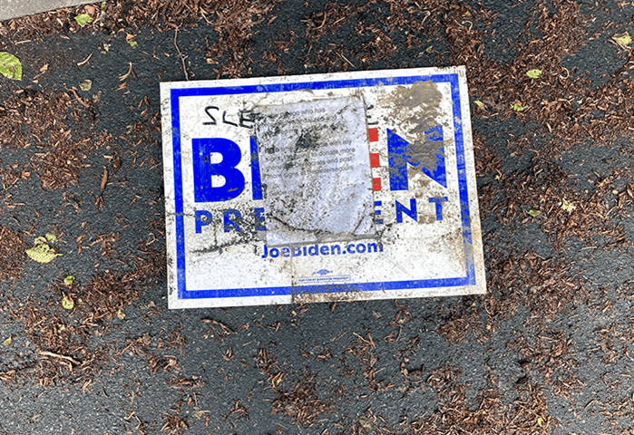 Beginning in June of last year, a political sign appeared at the intersection of Juanita-Woodinville Way and 112th Ave NE. A few days later the words “Sleepy Joe” appeared on the sign.