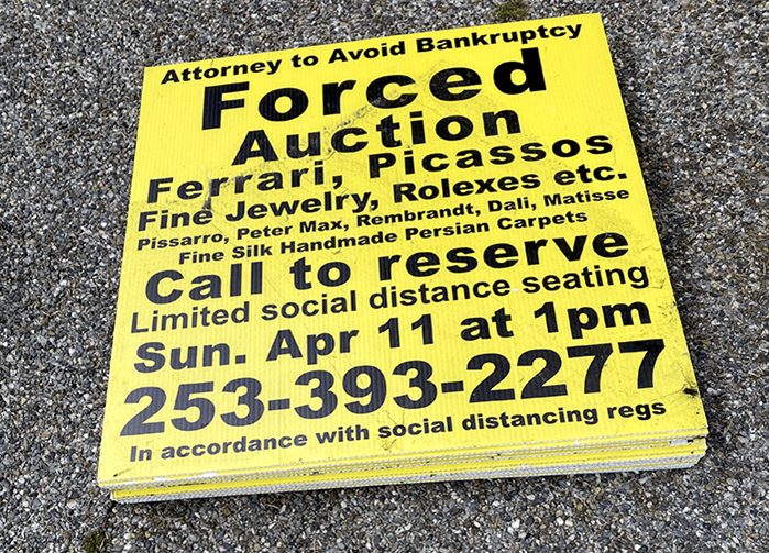 After some scam artists plastered a bunch of auction signs by the freeway a few weeks ago, we have been picking up these and other downed signs. We placed them in the corner of the park-and-ride hoping the Metro guys would pick them up. They didn’t, so in the afternoon, on the way back from an errand, we picked them up with our car.