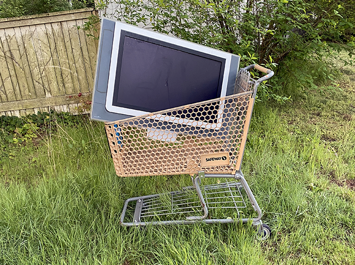 The TV was reasonably small but was an old Philips plasma TV and weighed a lot. We left it by the sidewalk and will contact the City of Kirkland. Though, based on past responses, we are not hopeful. Maybe Safeway will take their cart back and dispose of the TV.