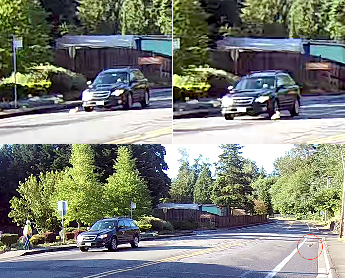 On the way home, we spent a night in Hood River, Oregon. When we were about thirty miles from Hood River, we were following a truck when we saw an animal ahead that looked like it might be a coyote, but it was a medium-sized dog running at full speed up the road in the opposite direction from us. As it passed us, we could see it was wearing a harness. Both the truck and we pulled over. The truck continued on, but we decided to turn around and try to head the dog off. The highway was not busy but was winding with sections of short visibility.