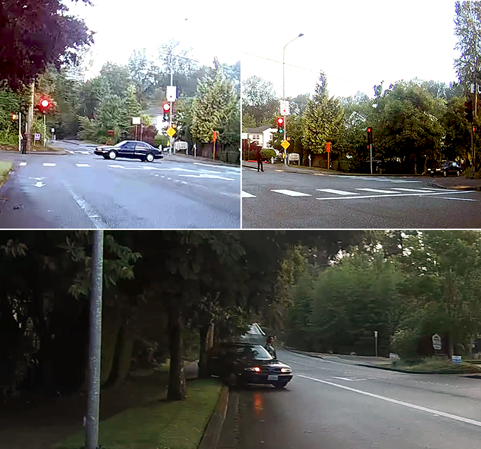 Early in our walk as we approached 102nd Ave on Riverside Drive, we saw a car rolling backwards through the intersection with a girl following on foot. Our first thought was that she had got out of the car without putting it in park. The car jumped the curb and came to rest, relatively unscathed between two trees. There was a man in the car who had gone for help by the time we reached it. Talking to the girl, the engine died and started rolling backwards. We wished her luck and went on our way. After we had gone about a block, we heard an engine roar behind us and saw the car roaring up the hill and turn into a parking lot.
