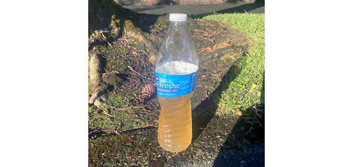 A water bottle with a yellow fluid in it. And yes, it was what you think it is.