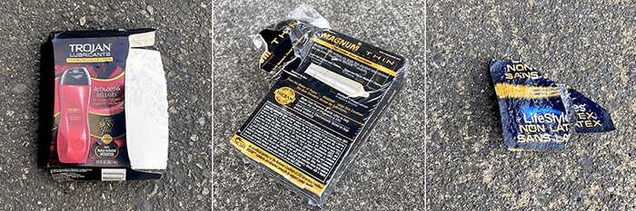 Okay, we get condoms discarded in secluded areas, but seldom along well-traveled roads. Talk about distracted driving. They were probably also using their cell phone at the same time.