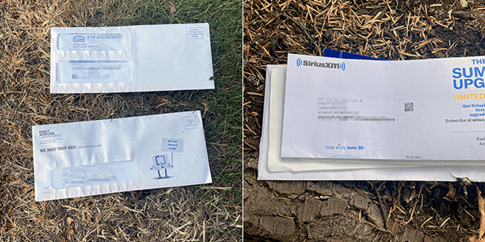 We found several pieces of stolen mail, all of it junk, except for what looked to be a mailed high school report card. The student may have intercepted it and tossed it, but we helpfully put it back in their mailbox.