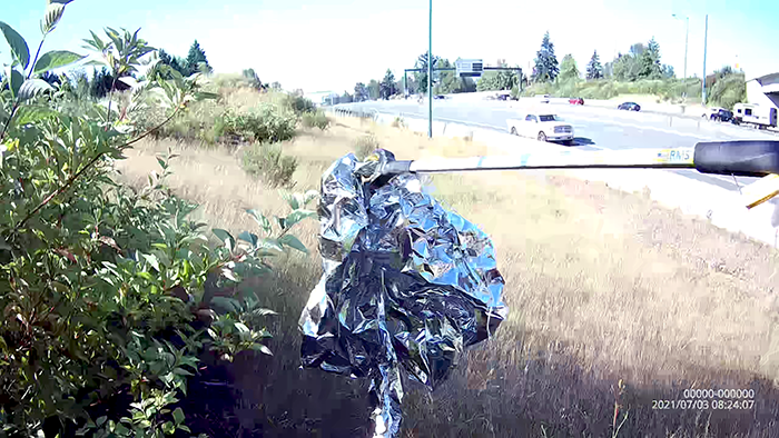 On Thursday when we crossed the freeway, we looked down and saw a very visible piece of debris. We decided to pick it up on our offramp trip by crossing the mound between the freeway offramp and the freeway.
