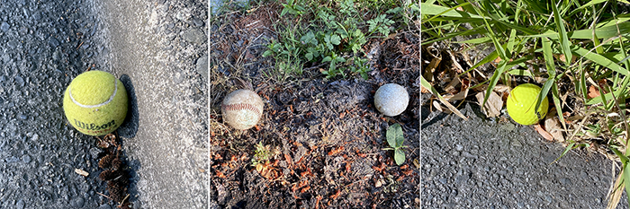 Four of them, actually. A tennis ball in the gutter, baseball and well-chewed ball near each other, and a golf ball at the park-and-ride. The chewed ball went into the garbage. The others went into our now well-organized ball collection.
