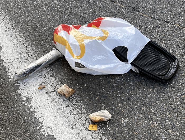 We found two McCafe beverage cups used for tea which is a good sign that the McLitterers were here. Then, about a half-mile farther, the bag. This one was slightly different. The bag contained the usual used teabags and two clean platters, but the unused condiments and utensils were missing. Maybe McDonalds has wised up to them.