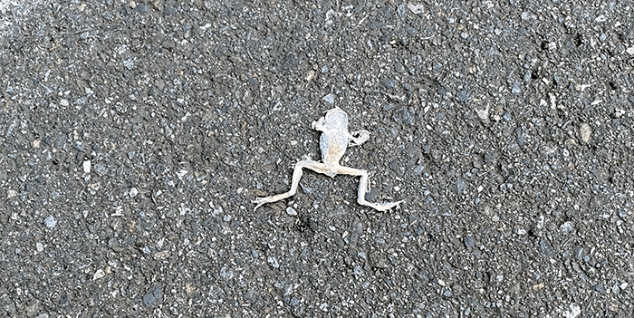 This morning, we removed a rat and a frog from the road. Normally we do not show photos of roadkill, but this reminded us of a the roadrunner and coyote cartoons, but with a frog.
