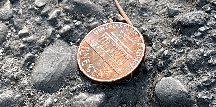 This morning was a perfect day for walking with clear skies and a temperature of 55°F (12.8°C). We did remove a roadkill rat, but we did find a penny.