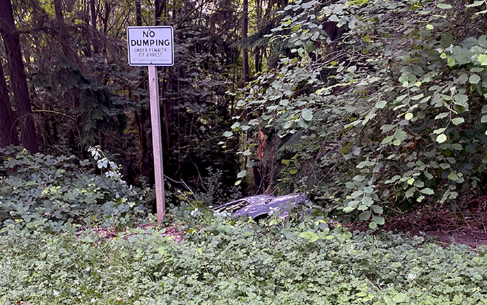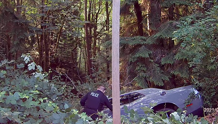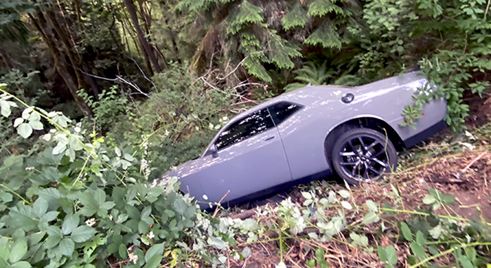 We shined our flashlight down the hill to see if it was occupied. The windows were tinted, and it was difficult to tell, but it appeared to be empty. We called the Bothell Police Dispatch and explained the situation. The dispatcher asked about anyone in the vehicle, so Chuck climbed down the hill for a closer look. It was empty.