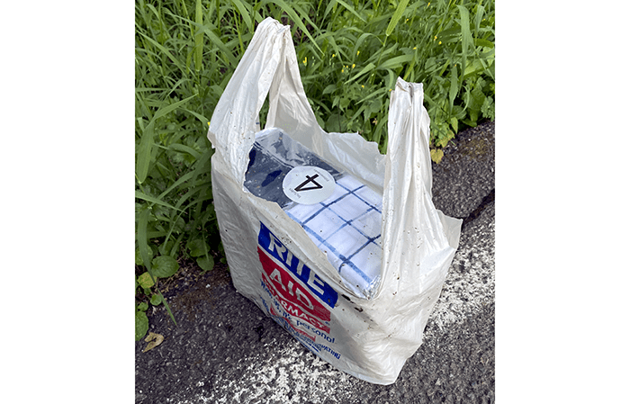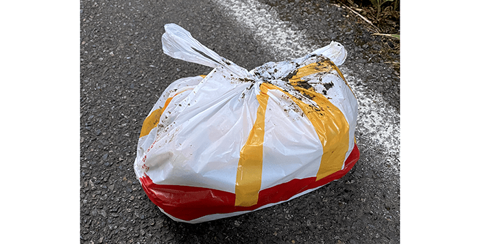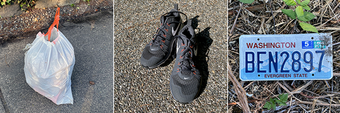 We got a large bag of trash, including the bag, a 2018 license plate, and a pair of Nike Flywire shoes. The shoes had been suspended in the brambles by the shoestrings and were good condition. Chuck’s size, too.
