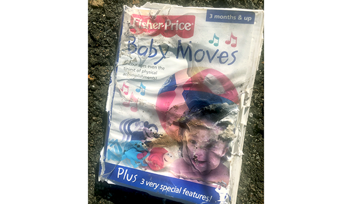 We found an empty discarded Fisher Price Baby Moves DVD case.