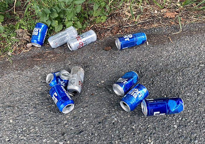 There is a gully on Norway Hill that we look down and see cans that were tossed. When we can see five, we climb down to retrieve them.
