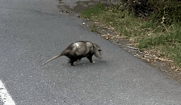 There was a pickup truck parked across the road with a young couple in it. Janet spoke to them. They had been watching the opossum for about fifteen minutes. They asked if we were from PAWS, probably because of our vests. Later in the day, we drove down the street and were glad there was no roadkill Opossum.