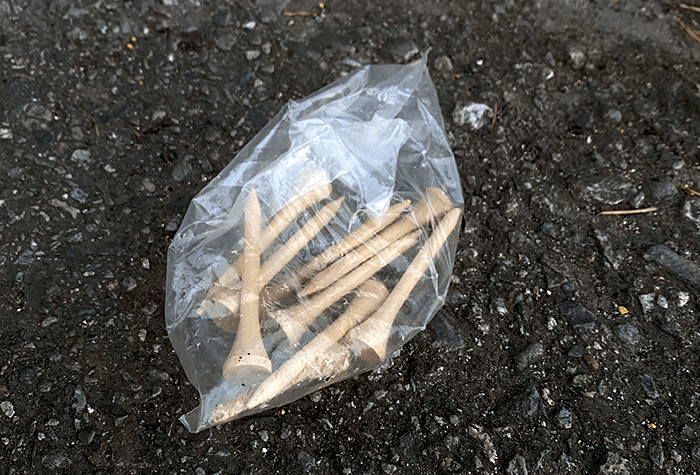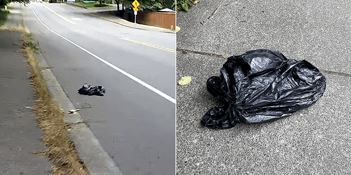 We could tell from the weight that there was something in the bag and from our TrashWalking experience that the bag contained a dead animal. It was a rabbit. We emptied the rabbit and placed it behind some bushes.
