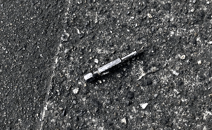 A very badly beat-up tape measure at the freeway onramp. We have found several of these on our walks, mostly serviceable. This one was not.