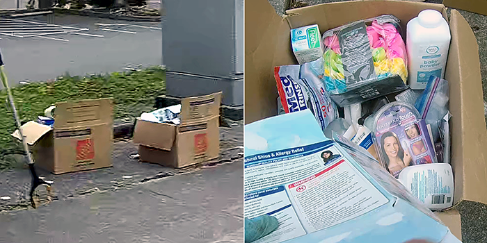 They were filled with toiletries and other bathroom supplies, some opened and some not. We closed them up and carried the boxes to the Senior Center entrance hoping they would take care of them once they opened for the day.