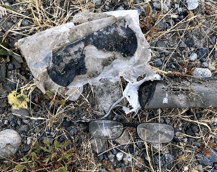 A pair of very disintegrated sunglasses and a pair of reading glasses and case. The only thing worth keeping were the reading glasses that, when cleaned up were in pretty good condition. The strange thing is there are no markings of any kind on them. Most likely counterfeit. We hear there is a big black market in reading glasses.