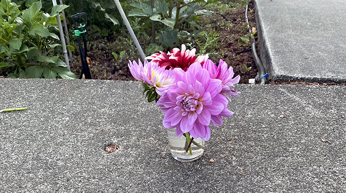 As we took a photo, a voice yelled, “Take them.” A guy was tending some flowers on the porch. We thanked him, but declined. Nice gesture, though.