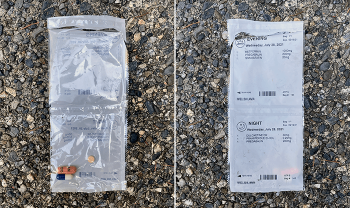 The evening pills were gone, but the night pills remained. We checked out the usage of the pills: Parkinson’s disease, restless legs syndrome, nerve pain, anti-diabetic, and high cholesterol. They missed the athlete’s foot, though.