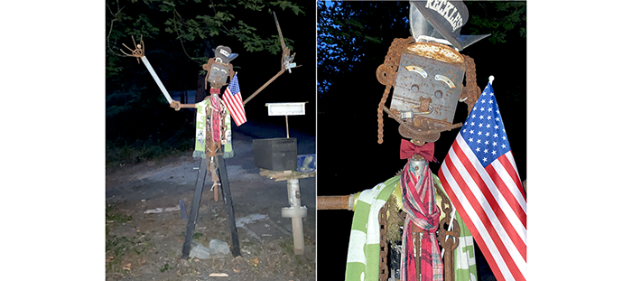 Several months ago, the Iron Man of Norway Hill appeared. Since then, folks have been adorning it. A few weeks back we found a bow tie. What the heck.