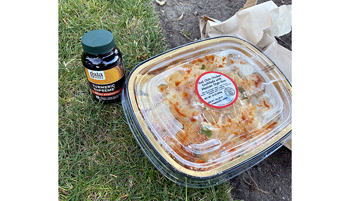 Turmeric pills and Red Chile Chicken Enchilada with Mexican Style Rice. We looked up the Turmeric and it looks to be a healthy supplement, and vegan, to boot. The Chicken Enchilada, not so much.