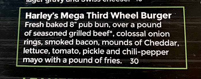 We tried a couple, including the Nectar of the Gods IPA from White Bluffs Brewing in Kennewick that we liked very much. On the menu was Harley’s Mega Third Wheel Burger.