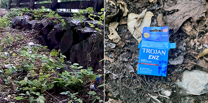 On the left was a random collection of cups, red straws, and other trash tossed into the ditch from the bus riders. But there was also an empty carton of Trojans. Guess that is a viable option while waiting for the bus.