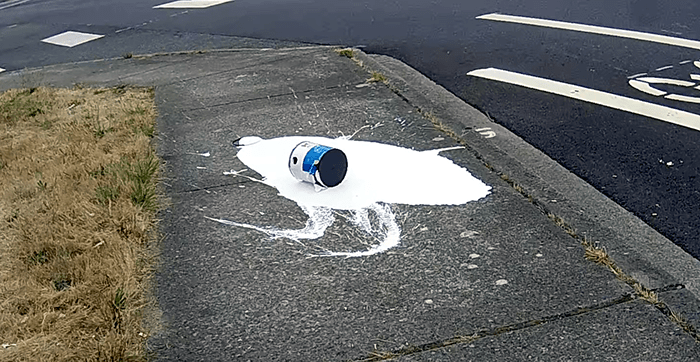 By the freeway offramp, someone lost a gallon of paint on the sidewalk.