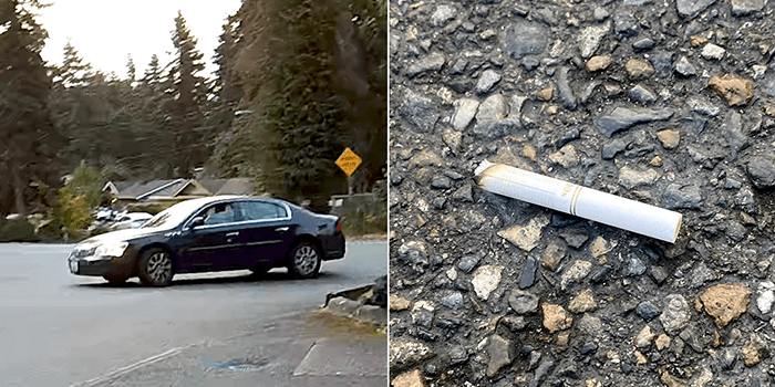 As we were entering the Safeway parking lot driveway, a car drove in and the driver flicked a cigarette butt out the window.