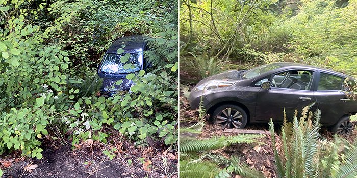 Early last July, there was a brand new Dodge Challenger. Today, it was a few-year-old Nissan Leaf. No one was in the car, and, having been through this before, we called it in to the police. We then descended the hill to get a photo of the VIN and license plate. Last time, the police officer wouldn’t let us keep the Challenger. We were hoping this new officer would have a different opinion, but it turned out to be the same officer and he recognized us. He still would not let us have it, but it was an old Leaf, and we have a newer one. Sour grapes. What worries us is, we are now the person of interest for two wrecked cars at the same corner near out house. No good can come of this.