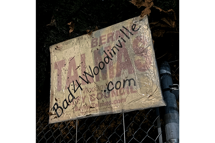 They reused an old Bernie Talmas election sign who was a Woodinville City councilman and mayor several years ago. Kudos for reusing old signs. Brickbats for not picking up their campaign litter. We recycled it.