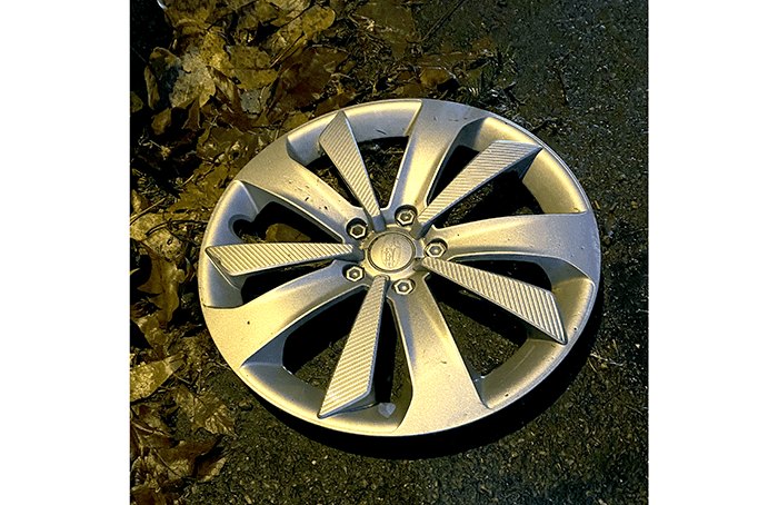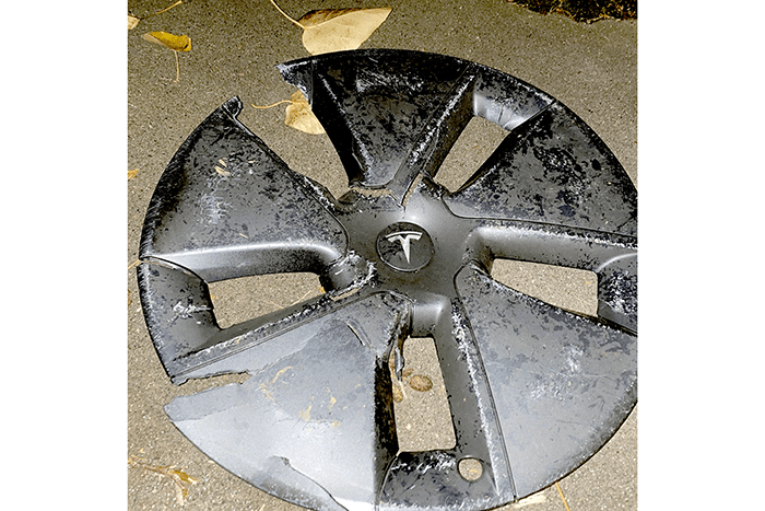 A Tesla wheel cover which we ultimately recycled. But shouldn’t we be able to tell it to recycle itself? We did find several other pieces of wreckage in the area, so it may have been part of a fender bender. So, if a Tesla gets into a fender bender, does it get sent back to the factory for a driving refresher course?
