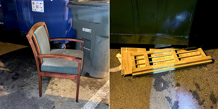 One was a nice chair that looks like it should be in a doctor’s office. We don’t know what the other is because the dumpster was sitting on it. The question is, is it a foldable piece of furniture or was it folded by the dumpster? Either way, it is probably pretty useless now.