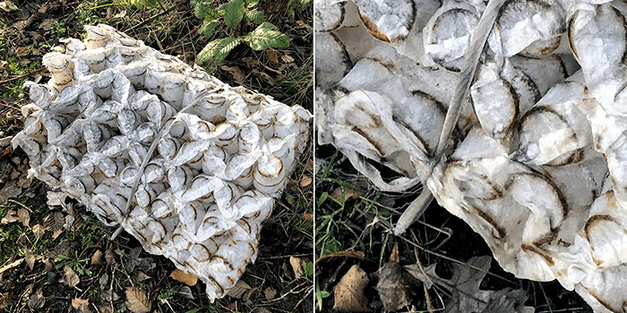 At least it was the coil springs from a mattress. Someone had rolled it up and tied it. We were tempted to cut the strap to see what would happen, but discretion is the better part of valor. We could get hurt, after all. It was too heavy for us to haul home, so we left it alone. One day the strap will probably rot and let it loose. We hope nobody is around when it happens.