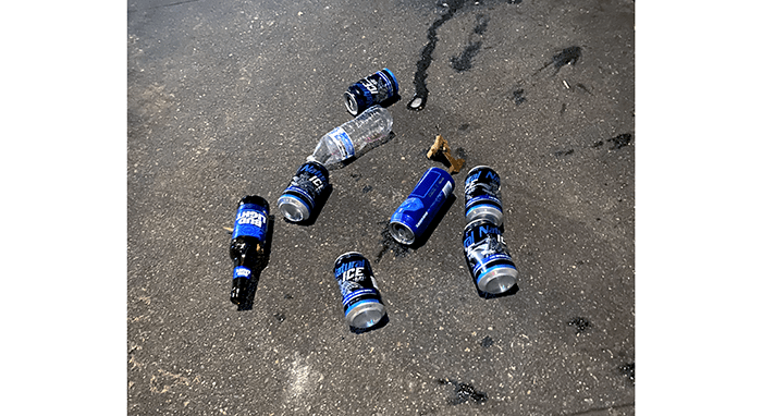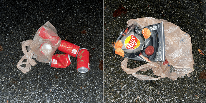 Okay, it was a six-pack of empty 4-Hands Wine cans. No, it does count as fast food. It was probably purchased nearby, and the bag contained an empty Lays BBQ Chips bag. See, fast food. And they drank responsibly by not drinking on an empty stomach before continuing on the freeway.