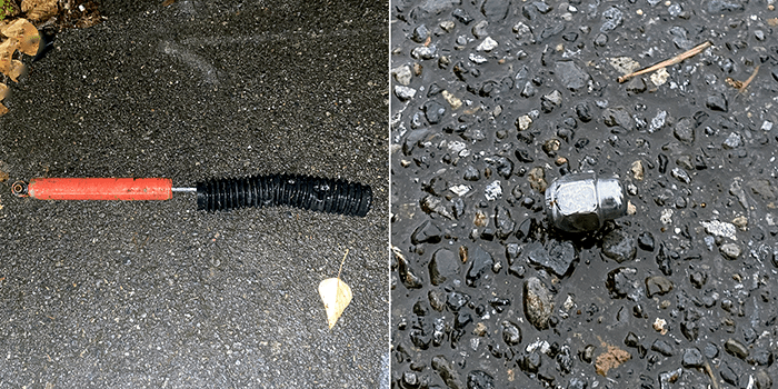 The first was a shock absorber. This was a first for us. It was heavy, but fortunately, it was near one of our standard drop-off dumpsters. The other was a lug nut which was found, disturbingly near our home.